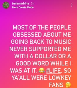 “Most of the people obsessed about me going back to music never supported me with a dollar or a good word while I was at it. #Life so Y’all were lowkey fans”.
